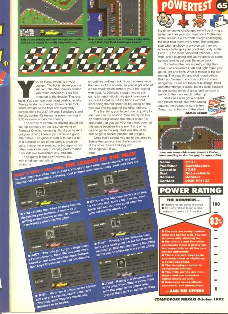 Oh come on, you know it’s true. The 8-bit micros were the domain of younger boys, and the computer was, for the very last time, hidden away upstairs surrounded by posters, dirty laundry and cans of Coke. The rest of this month’s games are demonstrative of the audience: the cheap and cheerful Slicks was amazing two-player fun for a lad and his best mate after school, with CF saying it could have “justifiably been released at full price”. It’s true, too:the £3.99 racer was so good, the urban myth goes it’s where the Nintendo game Micro Machines comes from. (Read our feature on Slicks here) Then there was the dry but engaging enough football management sim Match of The Day, which like all soccer games from the era has aged really badly. The “highlights” section, featuring a badly drawn Jimmy Hill and Des Lynam, is laughable now but was considered polished in 1992. “It’s classy and flexible”, said CF. “But at £9.99 you’d have to be seriously wealthy to splash out £9.99 on a management sim with knobs on.”