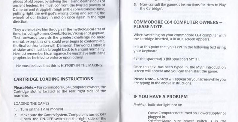 The first release was a straight offering of Myth, a fantastic fantasy platformer released earlier that year on cassette but offering nothing extra beyond a title screen and instant access. C64 computer owners also had to load the cart in a convoluted manner (see image below), which confused a lot of kids who thought they’d got a duff copy. Not exactly a “special” start.
