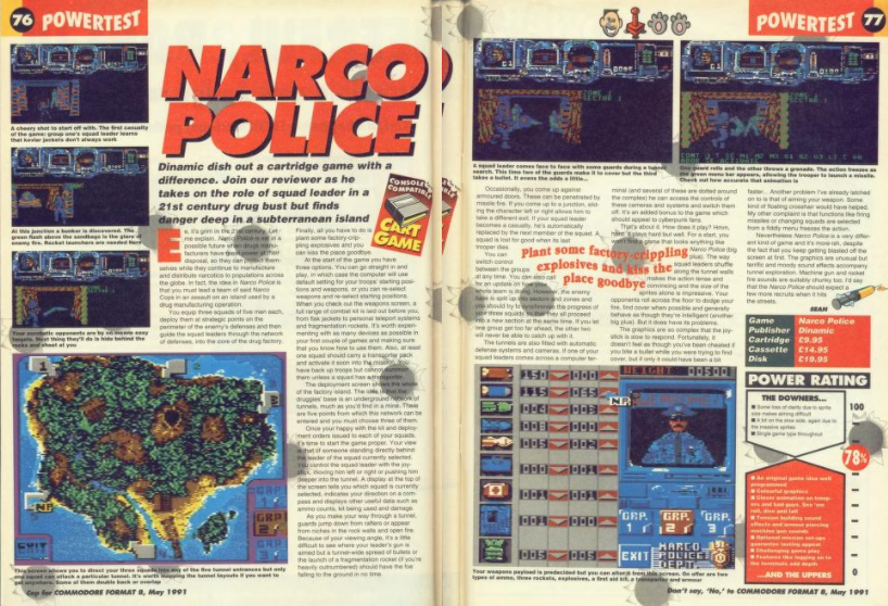 Spain’s Dinamic released at least five cartridges, four of which cause collectors to get a bit angsty. They’re super, super rare. Narco Police is the best-known and most widely available ‘cos it got an official UK outing, and it’s a pretty refreshing blaster. Set in 2003, it’s a 3D arcade adventure with a grim interpretation of the 21st century: in Narco, everyone’s a drug addict. You’re part of a team leading an assault on an island that’s being used by a manufacturing operation. The task? Shoot everyone in the face, of course. There’s mind and muscle involved to the violence, with both shooting and the tactical dispatch of your squad to play about with. It runs pretty slow during the 3D bits, but there’s more depth here than in your average Commodore outing. That said, it was still out on tape and disk.