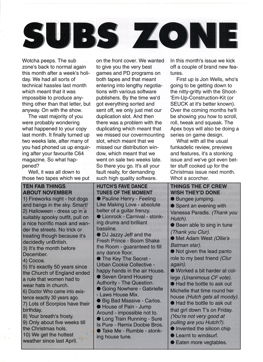SUBS LETTER, CF39. December 1993. Hutch’s Fave Dance Tunes Of The Moment. Which ages the magazine if nothing else on these pages does…